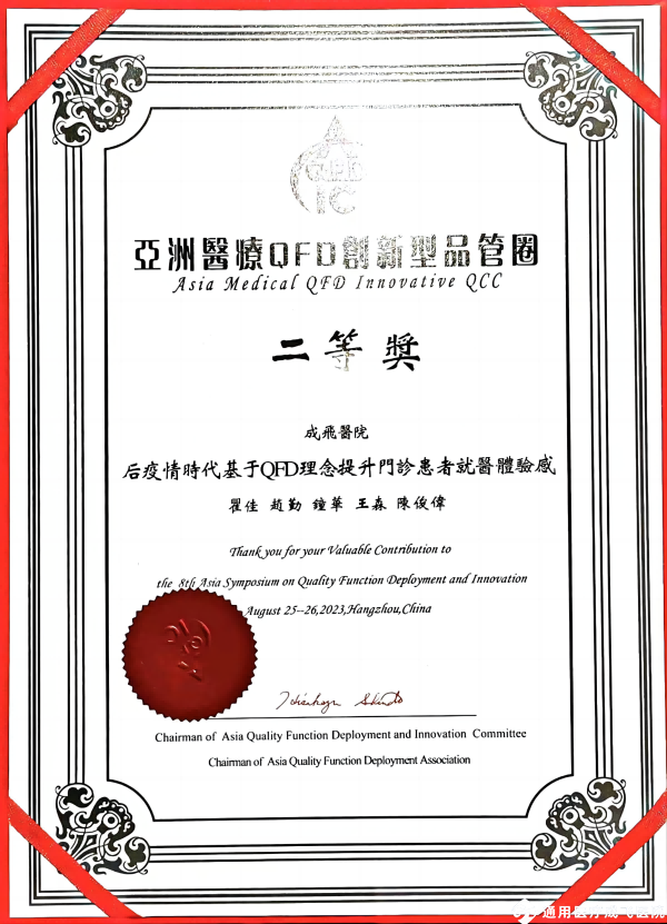 2023年成飞医院在第八届亚洲质量功能展开与创新研讨会暨质量改进与创新案例大赛中荣获二等奖