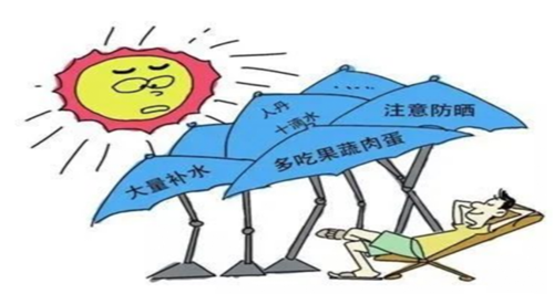 尽量避免在10:00 - 16:00气温最高时段外出,如必须外出则做好防晒措施;特别是户外工作人员在高温天气到来时注意防暑降温,及时补水、补充盐分;出门可派代宽帽檐的遮阳帽、太阳镜,并涂抹SPF15或以上的防晒霜。此外要备好防暑药品,如藿香正气液等。平时适当进行体育锻炼,增强体质,但要避免在高温时段剧烈运动;同时保证充足睡眠,提高身体的应激能力。