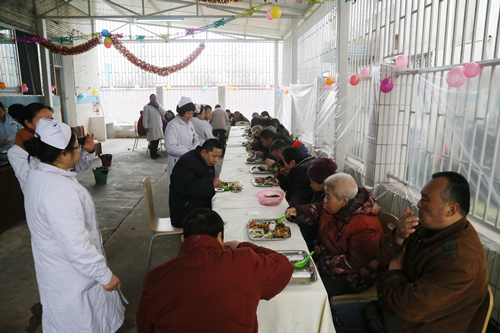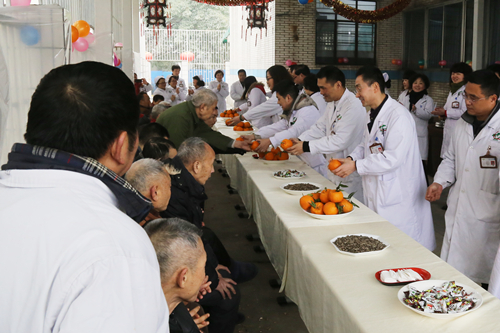 2015年2月10日,成飞医院精神科病房里伴随着欢快的乐曲声,不时传来阵阵瓜果和饭菜的香味。红红的灯笼、喜庆的春联、五彩的拉花让病房里充满了浓浓的年味,让患者感受到暖暖的情意。成飞医院班子成员、职能部门负责人以及精神科医务人员,在病房和他们共迎新春。